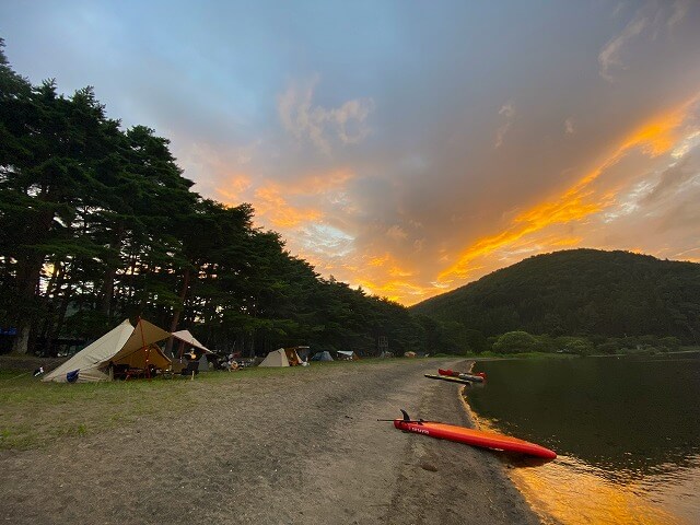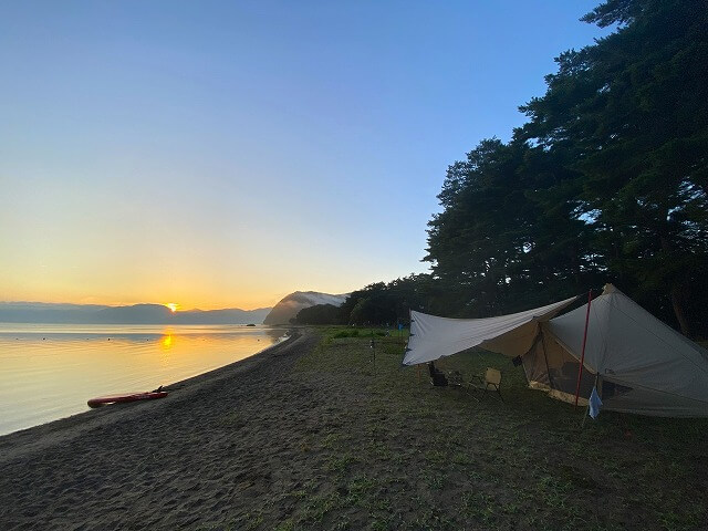 テントから1㎞ほど沖合まで来た時にようやく朝日が昇り始めますが、この瞬間のSUPは本当に気持ちの良くて毎回湖畔キャンプの時は沖合まで繰り出しちゃいます。