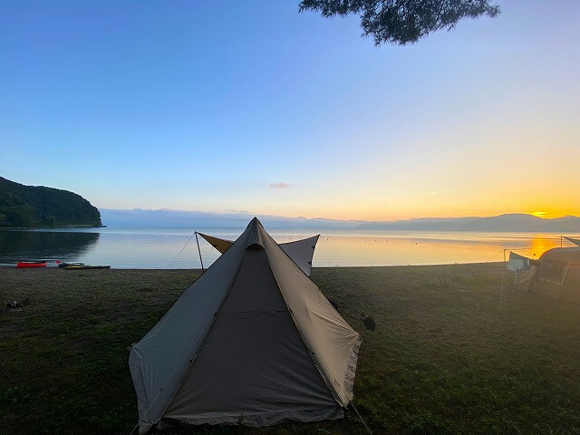 駐車場から荷物を運ぶ必要はあり少々大変ですが、猪苗代湖畔にサバティカル「モーニンググローリーTC」を設営していきますよ。