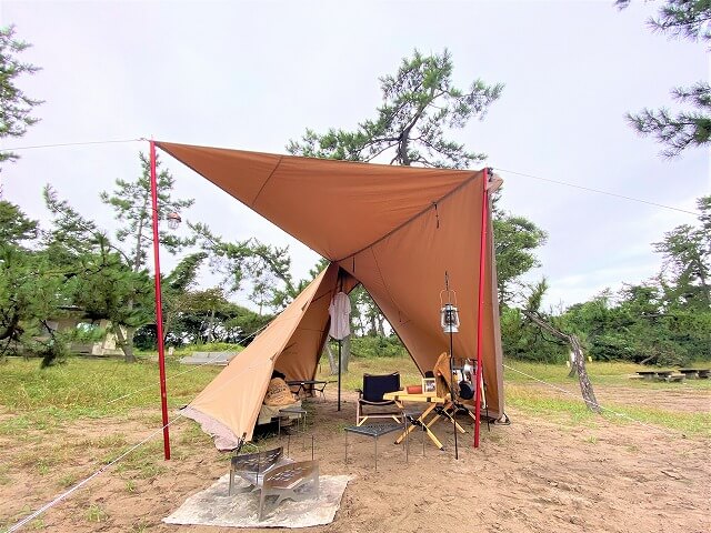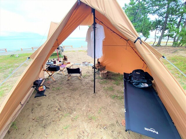 今回は海キャンプならでは遊び道具を持ってきているので、テント内はスカスカですが、タープ代わりに使うのであればこの大きさも有りですよね。