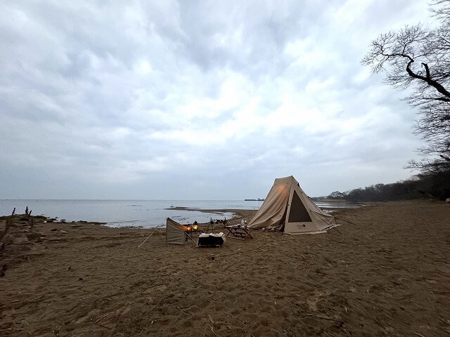 ここは無料開放された琵琶湖の湖岸緑地でキャンプも楽しめるようになっており、仲間は寒くないように筆者夫婦用に別にテントを設営してくれており有難いです!