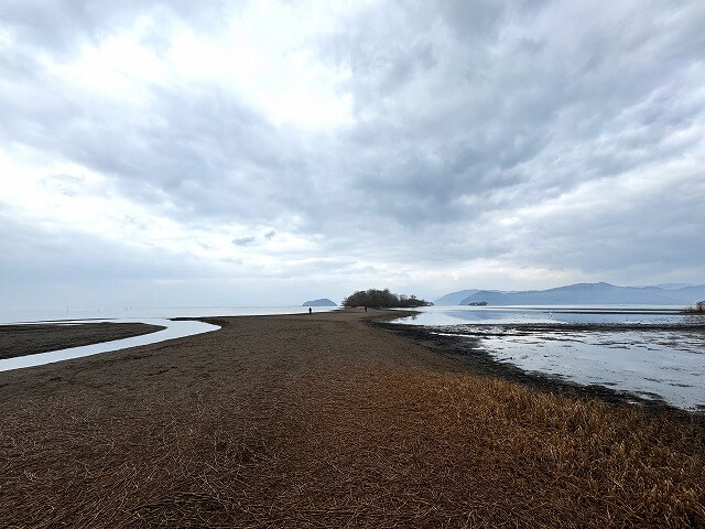 本来なら湖上にあり渡る事はできませんが、2023年は雨が少なく琵琶湖の水位が70~80㎝ほど低くなっており歩いて渡る事ができるんです。