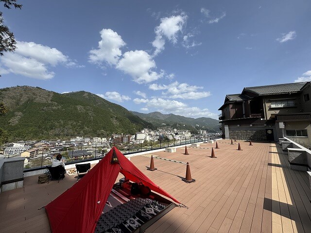 キャンプ場はホテルに面したルーフバルコニー上にあり、下呂の温泉街が一望できるロケーションなので解放感は抜群ですよ。