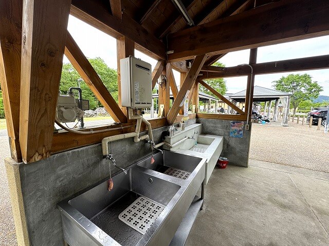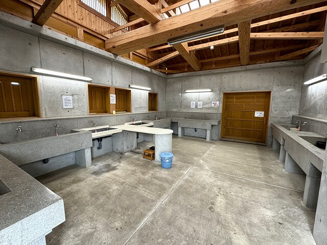 中の炊事棟は広くなっており、オートサイトだけで使うには十分すぎる蛇口の数になっています。