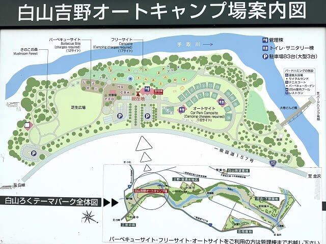 白山吉野オートキャンプ場は、最寄りの北陸自動車道白山ICから30分ほどで、国道157号線沿いにあるためアクセスも良好です。