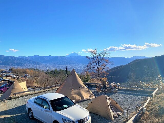 今回利用するのは、グループキャンプでも利用できるサイトのダイノジ9ですが、綺麗に雪をかぶった富士山が見えますよ。