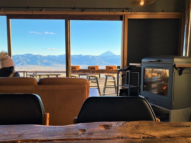 山頂の「CAFE山歩 SANPO」は、キャンプ利用者以外も利用出来るカフェで、暖炉にあたりながらの富士山は至福のひとときです。
