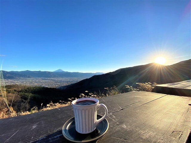 6時頃には知人も起き始め、遠くにハッキリと見える富士山を眺めながらのモーニングコーヒーが冷えた体を温め美味しいですね。