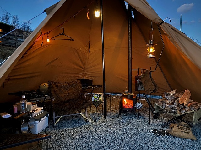 サイトに戻ると、一緒に来ていた知人は完全防寒して夜景を見ながら焚き火を楽しんでいますが、筆者は寒いので薪ストーブで暖かい幕内に入って就寝し本日のキャンプは終了です。