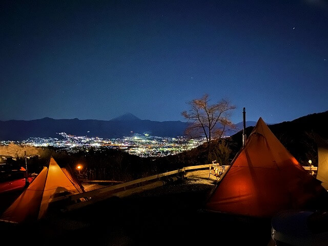 ほったらかし温泉でポカポカになった後はお酒を飲みながら山頂まで登ってみますが、夜景の奥には富士山も薄っすらと見える最高のロケーションです。