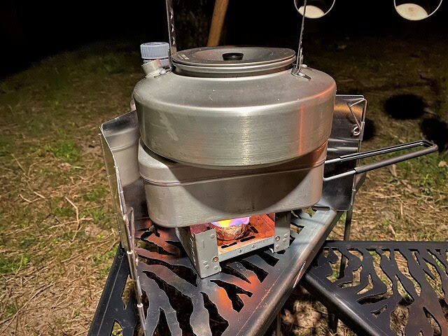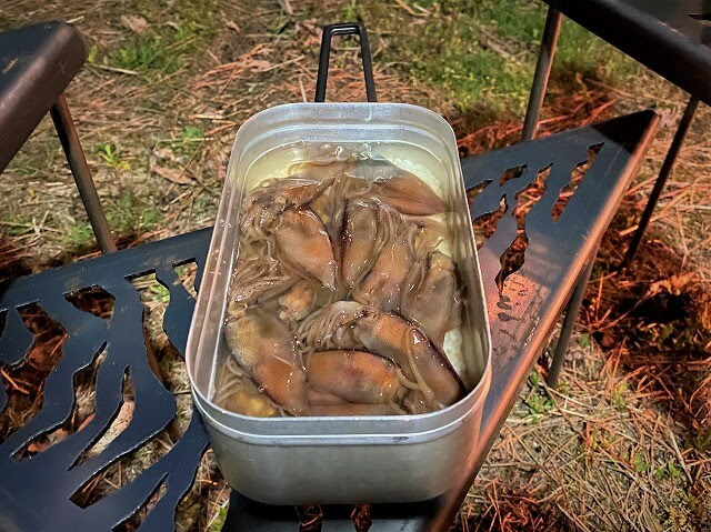 固形燃料で20~25分ほど炊き上げていきますが、具材のホタルイカの沖漬けは生でも食べれますが、固形燃料では火力不足の可能性があるので、ガスバーナーで炊き上げた方が美味しく炊き上げれます。