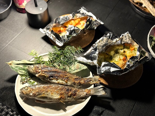 そして、夕食はスタンダードBBQプランの、ジビエ肉のソーセージやニジマス、地元の採れたて野菜やバーニャカウダ、地元産アルプスサーモンのアヒージョや本格ピザのうえに、地元のおばあちゃん直伝の五平餅と盛りだくさんです。