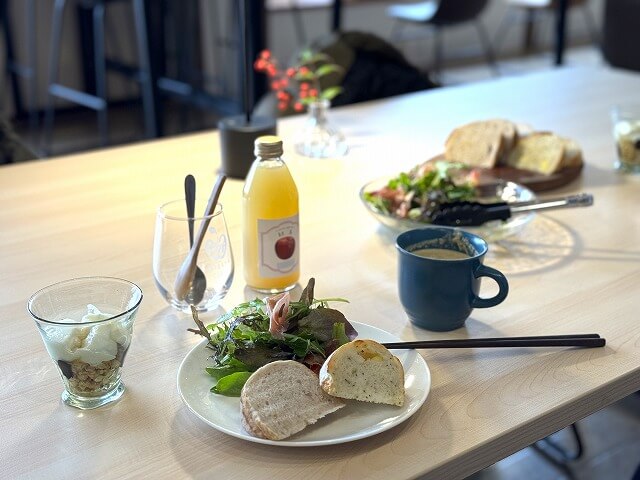朝食メニューは、地元パン屋さんのカンパーニュ、季節のポタージュ、地元の採れたて野菜、旬の果物、そして長野といったらりんごジュースですよね。