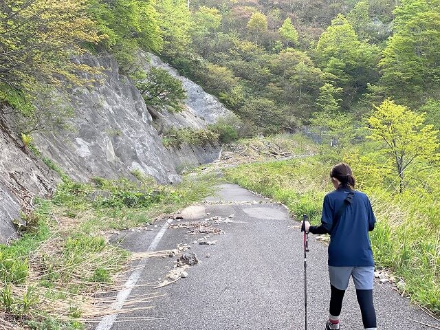 現在は通行ができない林道ではありますが、人が歩く分には問題なく足の負担が考え迂回していきますよ。