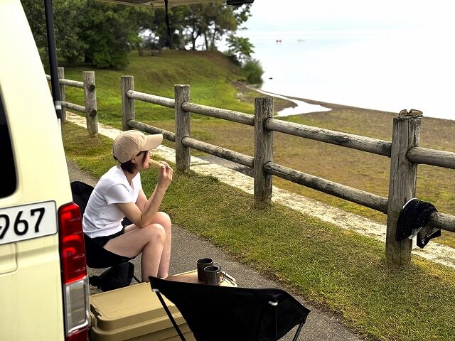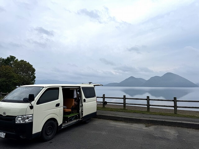 寝起きの嫁さんは洞爺湖を眺めながら化粧をはじめていきますが、やっぱりハイエースの車内から景色は最高ですね。