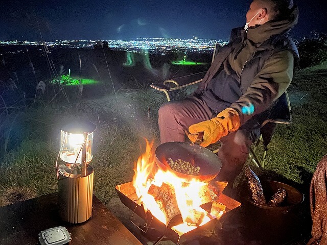 食後は夜景を楽しみながら、同僚が銀杏を焚き火で塩で煎ってくれます。