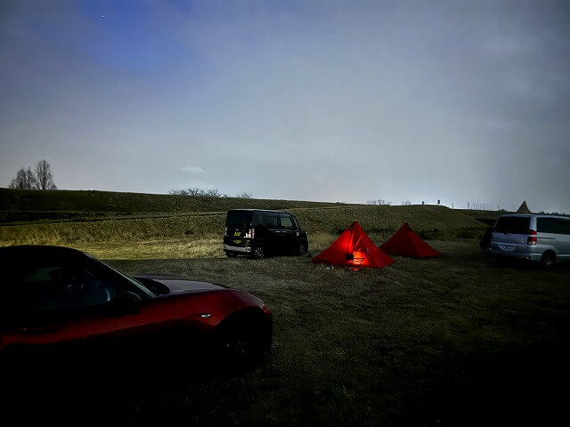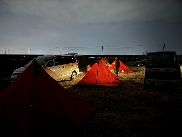 また、今回は5人参加でしたがそのうち3人は赤パンダなので、赤パンダ会みたいになっていますが、22時頃には雨も降りだし寒くなってきたので解散して、各自ソロを楽しんでいるなか筆者は明日も仕事なので早々に横になり本日のキャンプは終了です。